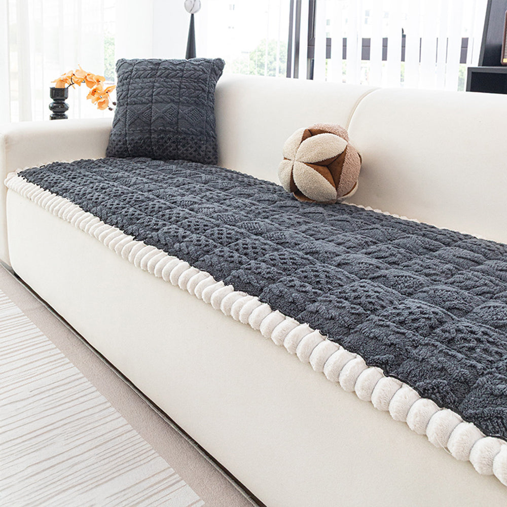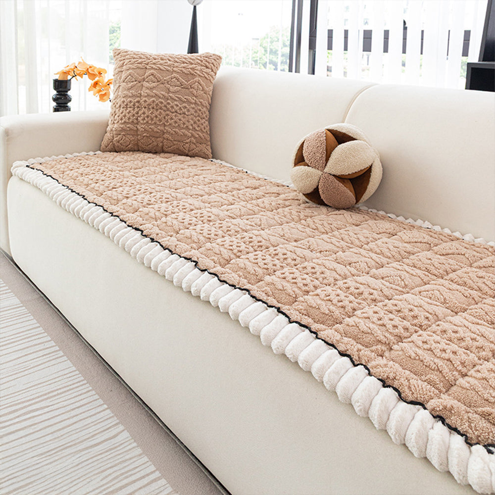 Envuelve tu sofá en una suave calidez con nuestra funda de sofá antideslizante de felpa Cozy Weave. Confeccionada con tela gruesa de pelo corto y tejido jacquard 3D, ofrece un tacto suave y una apariencia refinada y texturizada. El borde redondeado de felpa añade un toque elegante y acogedor, a la vez que protege los bordes del desgaste.