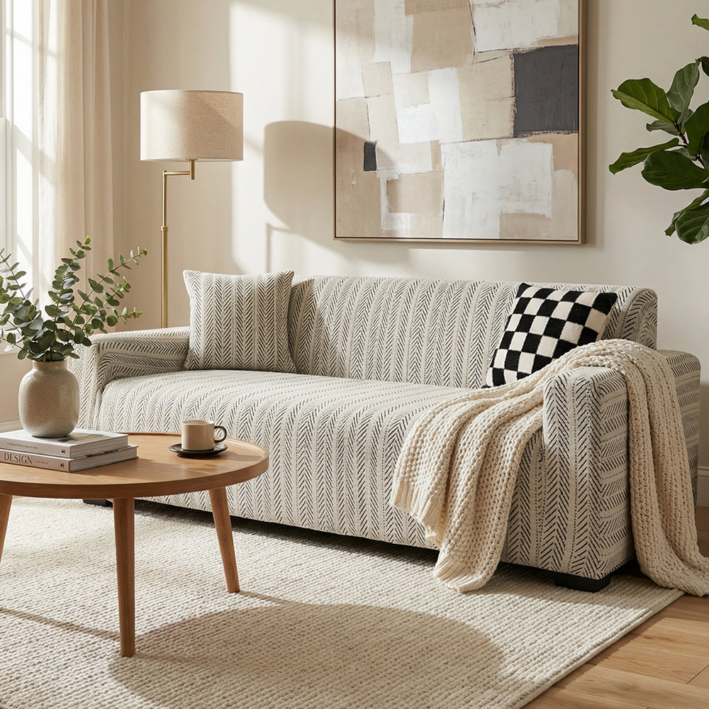 Funda de sofá minimalista premium neutra, suave, duradera y apta para mascotas: tejido de alta calidad para proteger tu sofá.