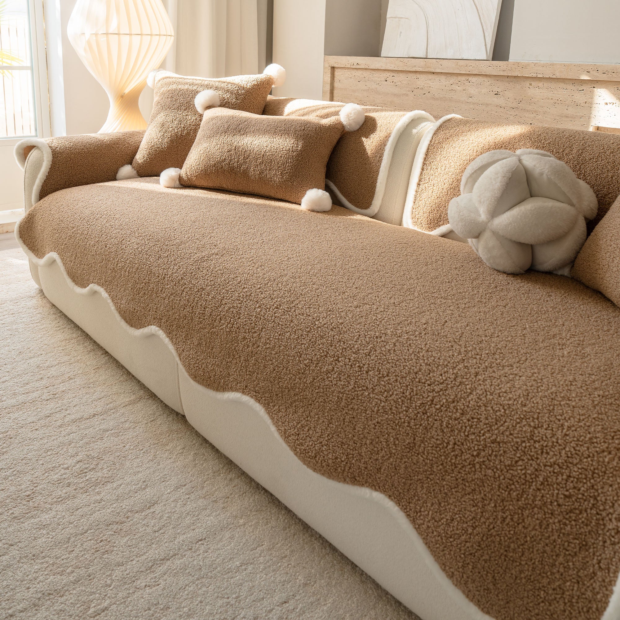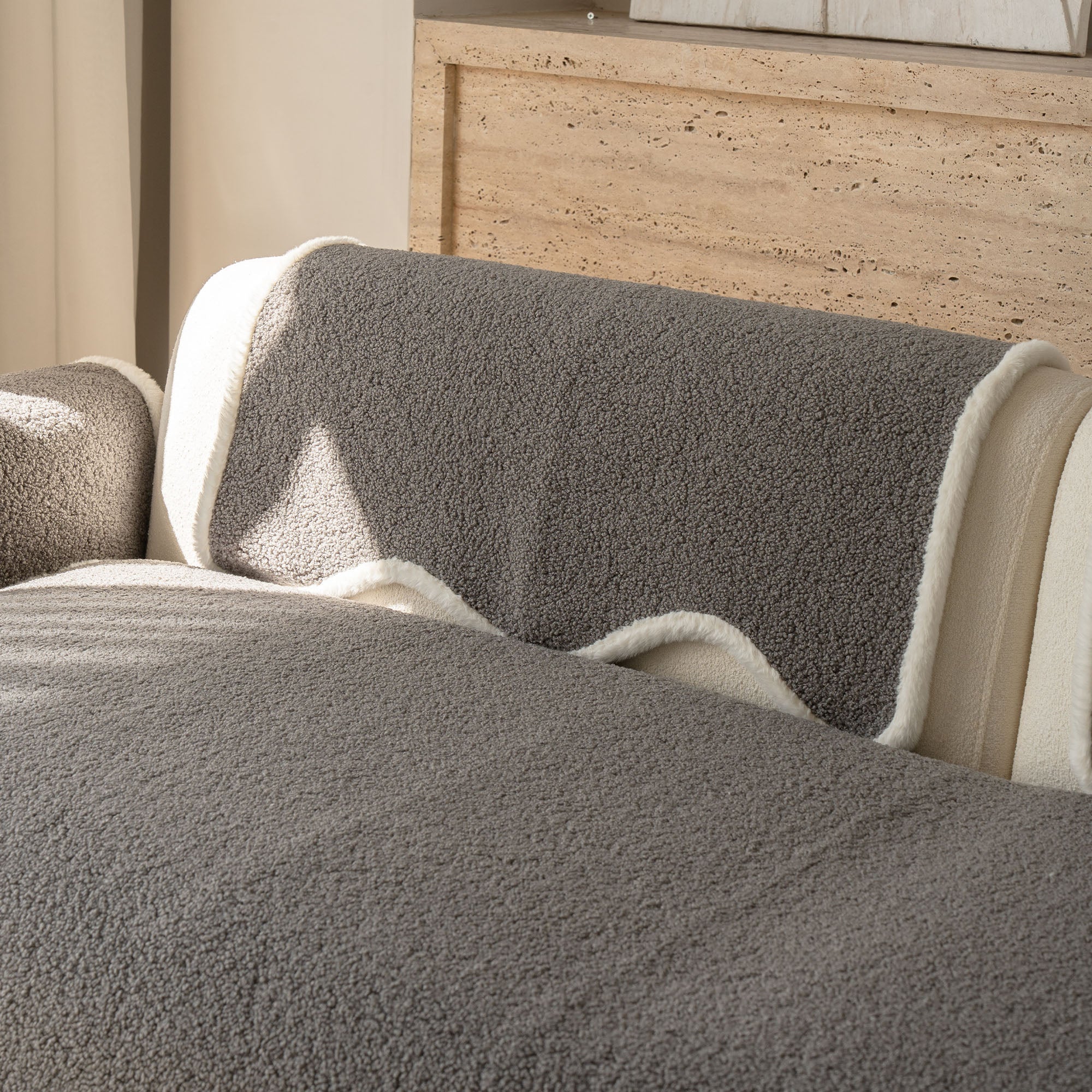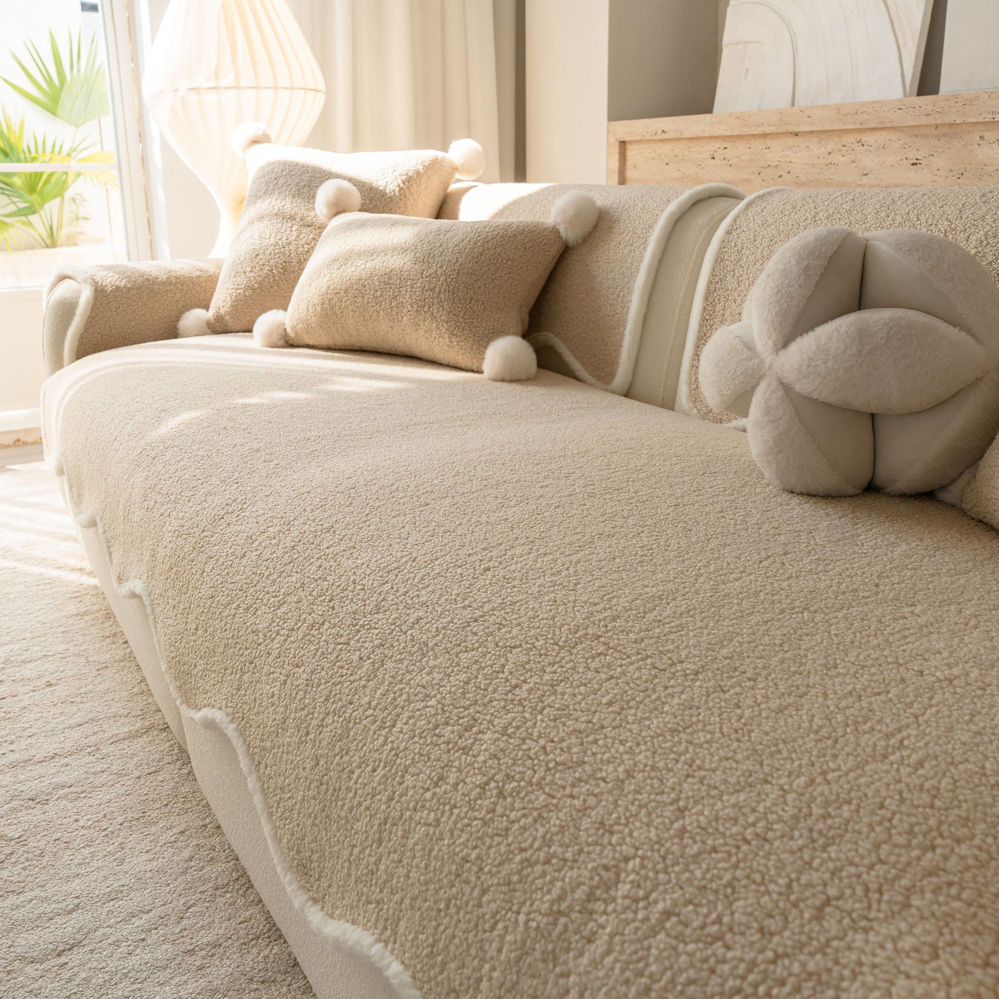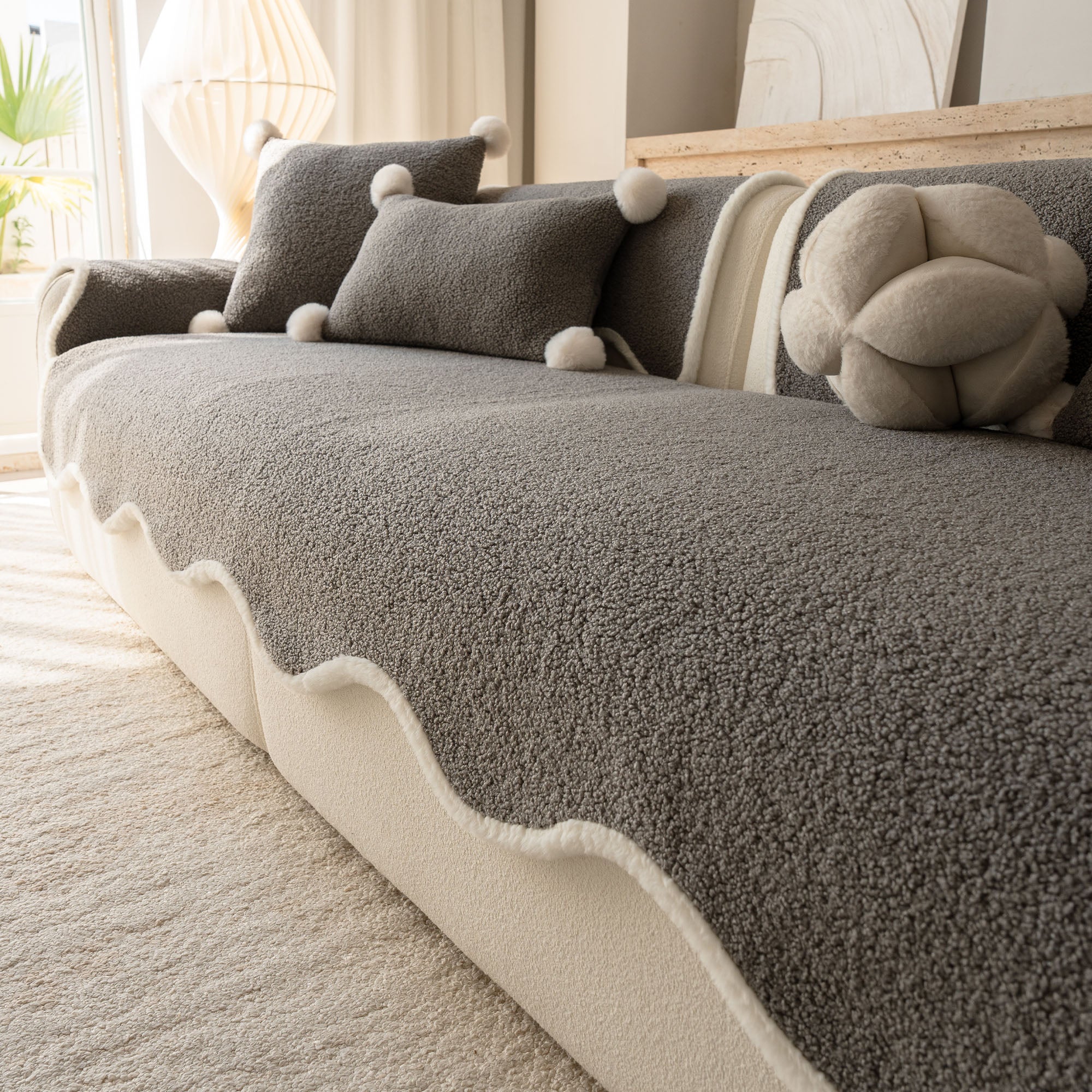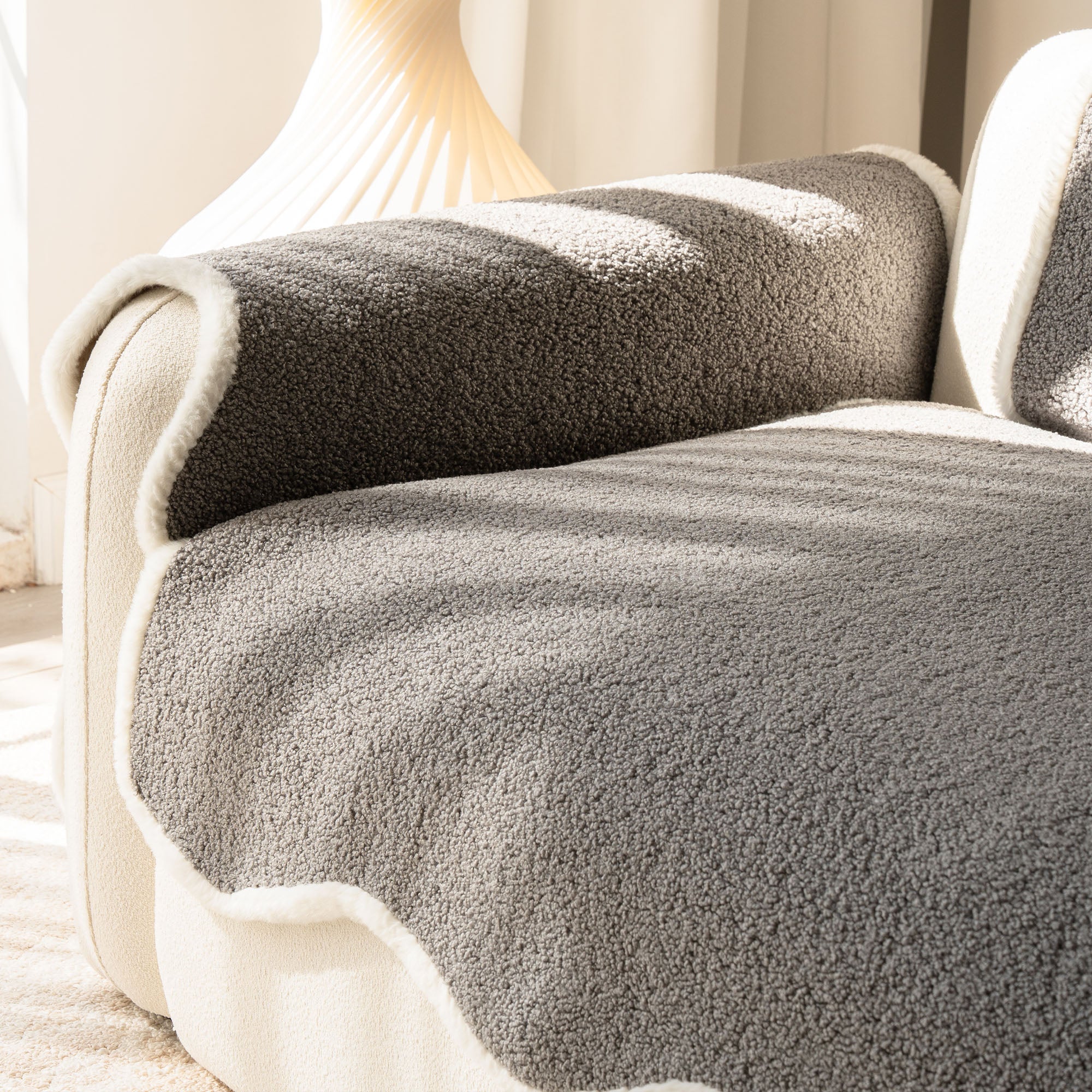 Envuelve tu sofá en un lujo silencioso con nuestra acogedora funda de sofá antideslizante de sherpa de piel de oveja. Su lujoso pelo sherpa de alta densidad es increíblemente suave y se mantiene impecable durante el otoño y el invierno. Su reverso antideslizante se mantiene en su lugar y se adapta a los cojines y reposabrazos, mientras que el borde suavemente festoneado le da un acabado refinado y de diseño. Apta para mascotas y familias, protege tu sofá del pelo, arañazos, migas y derrames cotidianos, para que tu sala siempre esté lista para recibir visitas.